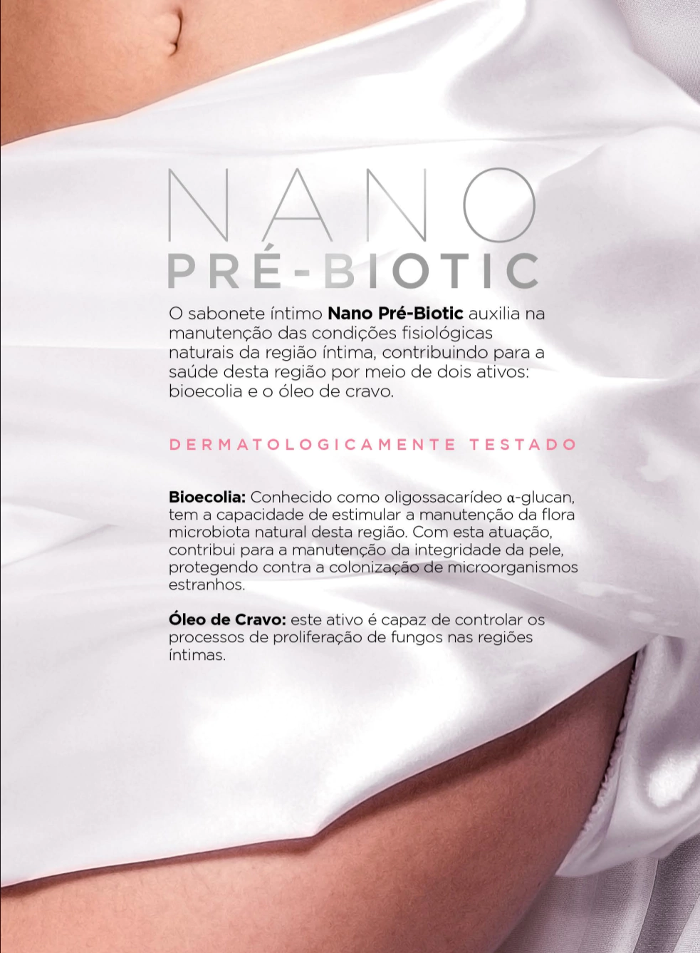 O Sabonete Íntimo Nano Pré-Biotic auxilia na manutenção das condições fisiológicas naturais da região íntima, contribuido para a saúde desta região por meio de dois ativos : bioecolia e o óleo de cravo.